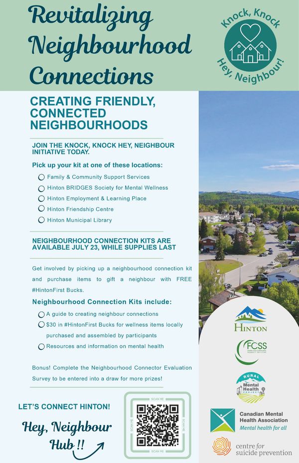 You can sign up for a kit at The HEY NEIGHBOUR HUB on the Town of Hinton website, or drop in at BRIDGES to learn more, sign up and receive your kit. You will take your kit, use the included Hinton First Bucks to purchase a wellness gift for your recipient, then go deliver it and introduce yourself to a neighbour you don't know yet!