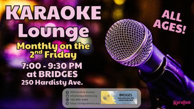 One the 2nd Friday of each month, enjoy our sober/family-friendly Karaoke Lounge events. Bring your singing voice and your besties. The song list is pretty much endless! Entry is free, but you can support BRIDGES by making a donation for refreshments. Many thanks to our volunteer Kara-hosts, Eric Rosendahl and Moe Prudhomme!
